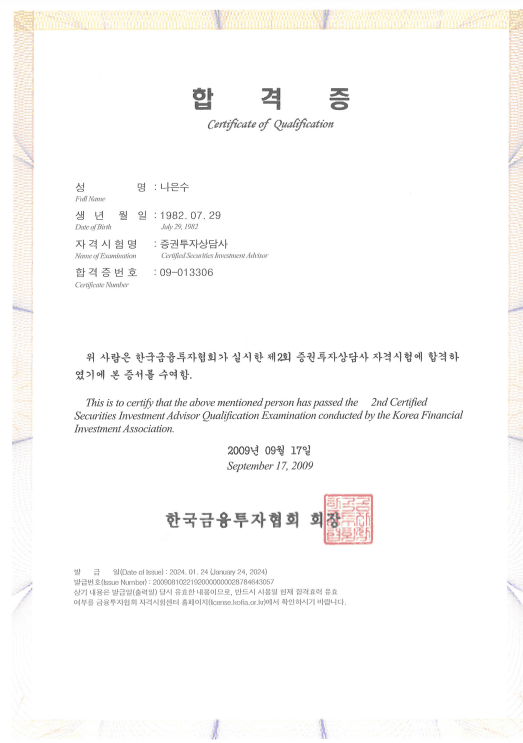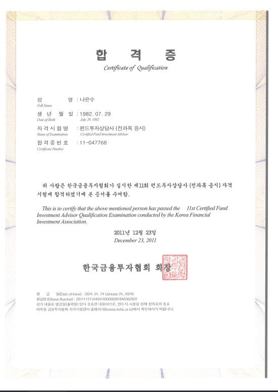 자산관리 매니저가 보유하고 있는 자격증과 이에 대한 설명을 확인해 보세요